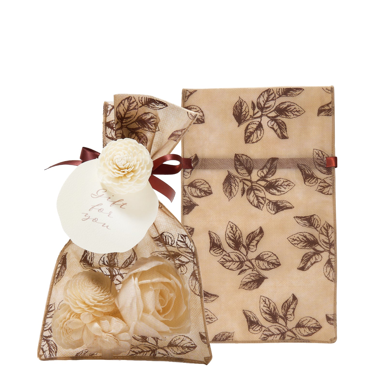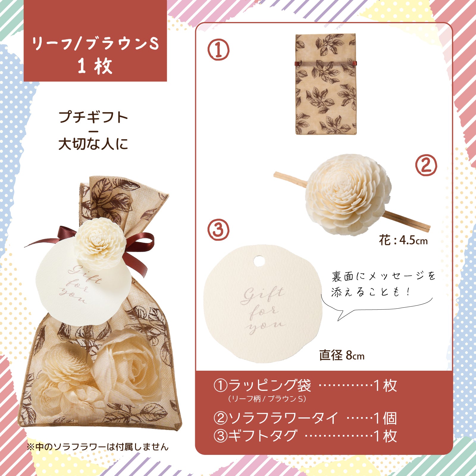 ・内容量:リーフ柄ブラウンS袋、ソラフラワータイ、ギフトタグ
